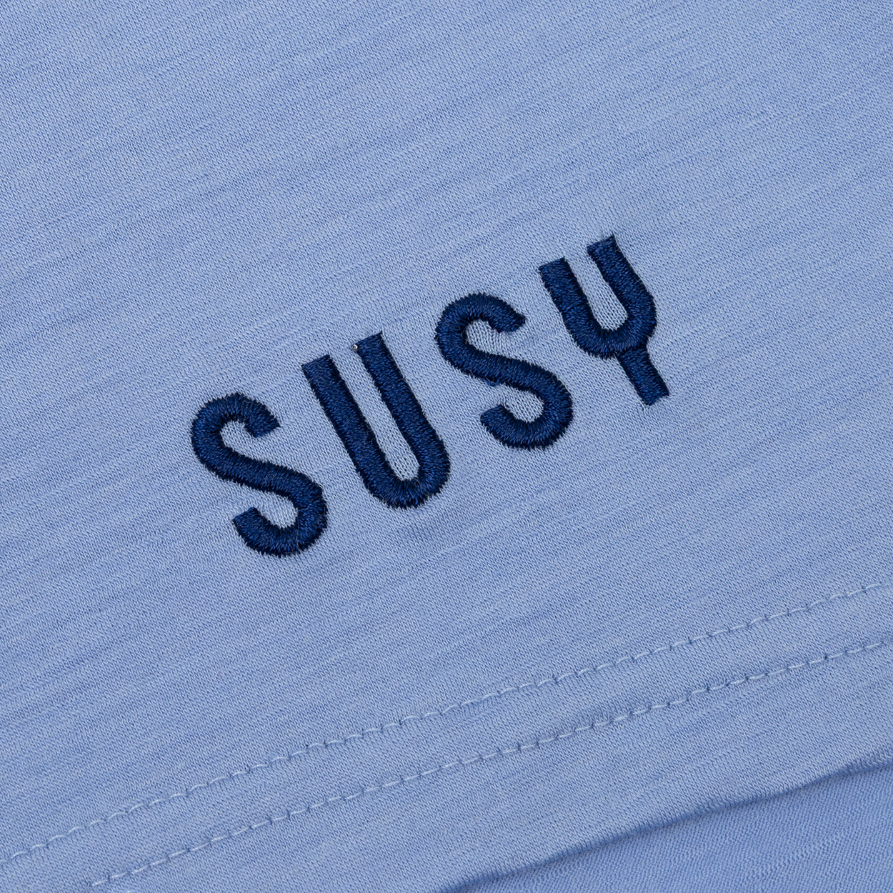 La chemise de cyclisme des femmes a une couleur de nuit. Cette couleur est entre le bleu foncé et le noir et est donc parfaite pour combiner avec d'autres vêtements cyclistes dames. Les manches courtes ont un logo unique composé des lettres du logo «SUSY». Les lettres de logo sur les manches sont aqua curacao et palais bleu. Ces couleurs se reflètent également dans les autres articles de la collection de vêtements cyclistes pour femmes de Susy cyclewear. La conception du logo sur les manches courtes donne une apparence cool et ludique.